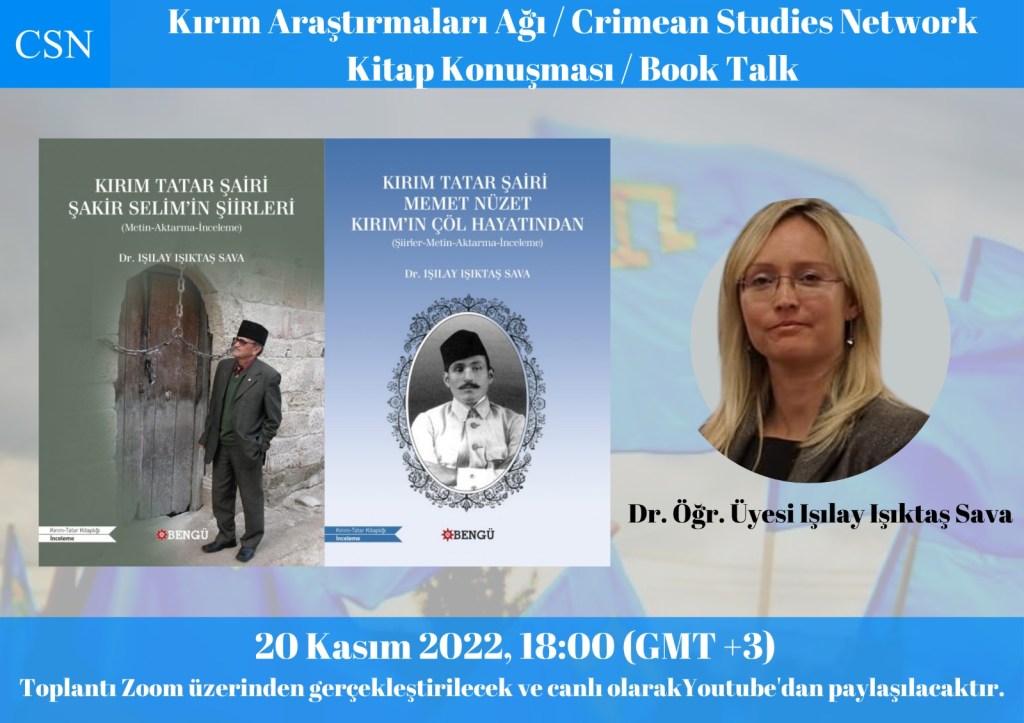 Kırım Araştırmaları Ağı’nda bu dönemin ikinci toplantısında Dr. Öğr. Üyesi Işılay Işıktaş Sava’nın geçtiğimiz günlerde çıkan “Kırım Tatar Şairi Şakir Selim’in Şiirleri” ve “Kırım Tatar Şairi Memet Nüzet, Kırım’ın Çöl Hayatından” adlı iki kitabını konuşacağız. Toplantı, 20 Kasım 2022’de Türkiye saatiyle 18.00’de Zoom platformu üzerinden gerçekleştirilecektir. Zoom üzerinden yapılacak programa katılmak isteyen akademisyen, uzman ve